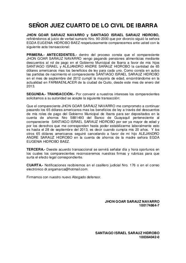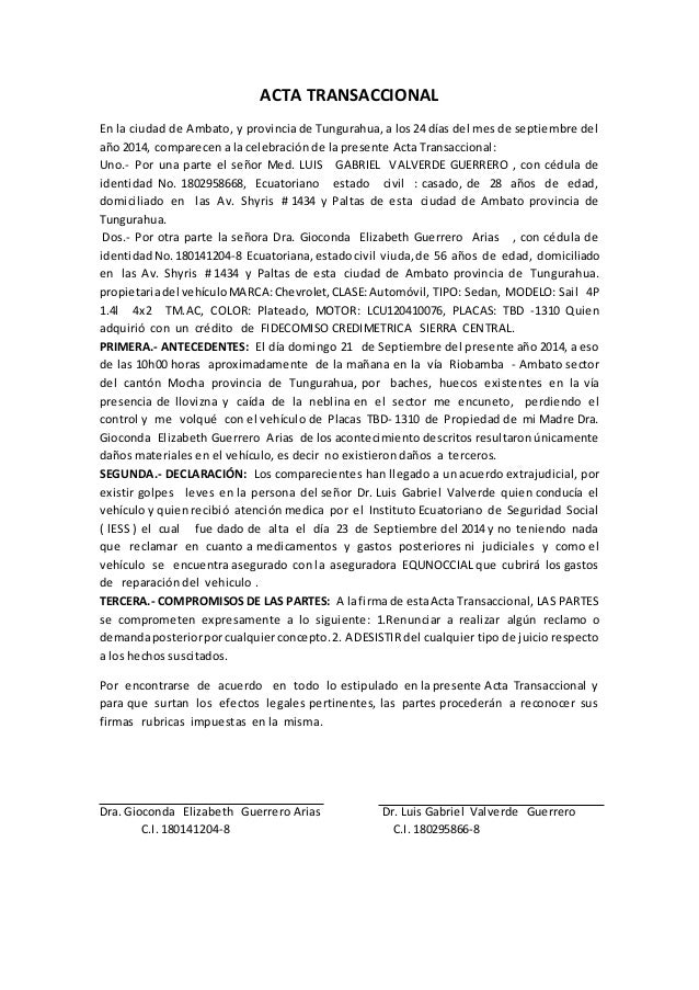 Hacindose concesiones recprocas extinguen obligaciones litigiosas o dudosas. Seor Notario de F Pblica en el registro de escrituras pblicas que corren a su cargo sirvase insertar un ACUERDO TRANSACCIONAL el cual se rige al tenor de las siguientes clusulas. Modelos de actas transaccionales.