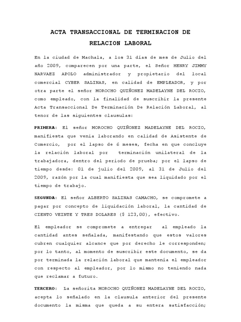 Acta Transaccional De Terminacion De Relacion Labora1 Pdf Liquidacion Derecho Laboral