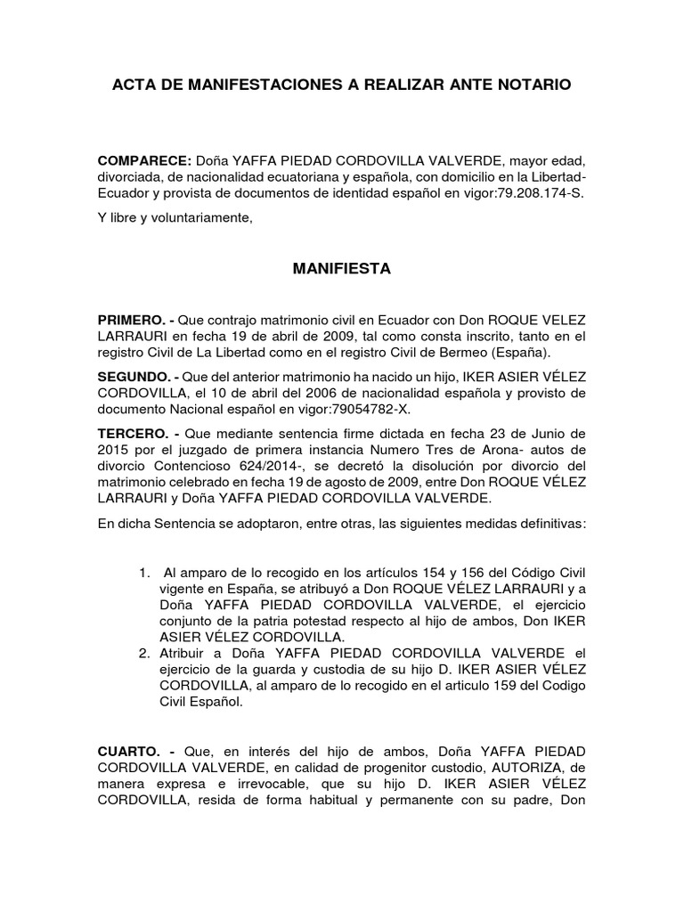 Acta De Manifestaciones A Realizar Ante Notario Pdf Divorcio Espana