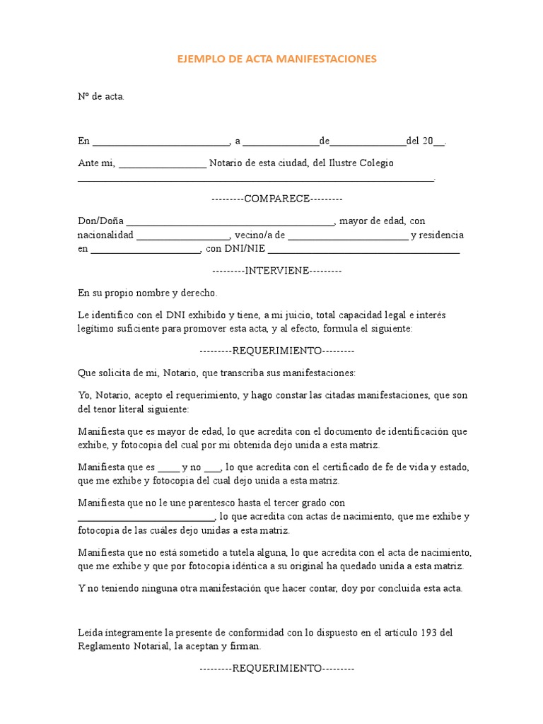 Modelo de acta de manifestacion. 1094880643 domiciliada en Villa Centenario manzana E 9 Armenia ante el Consulado General de Espaa en Bogot resrpetuosamente comparezco y como mejor proceda en derecho MANIFIESTO. Lgicamente el acta no acredita que lo declarado sea cierto pero s que esa declaracin se ha realizado. Acta de manifestacin- 1.