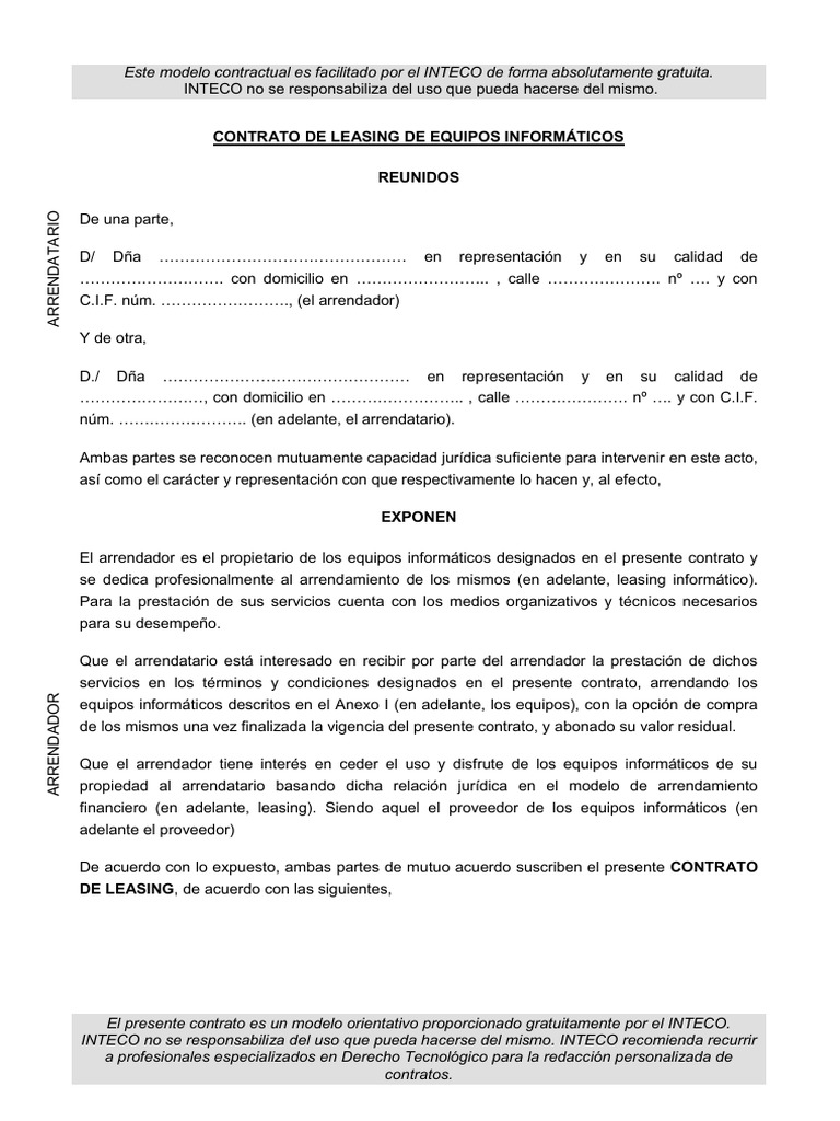 Contrato De Leasing Informatico Arrendamiento Alquiler